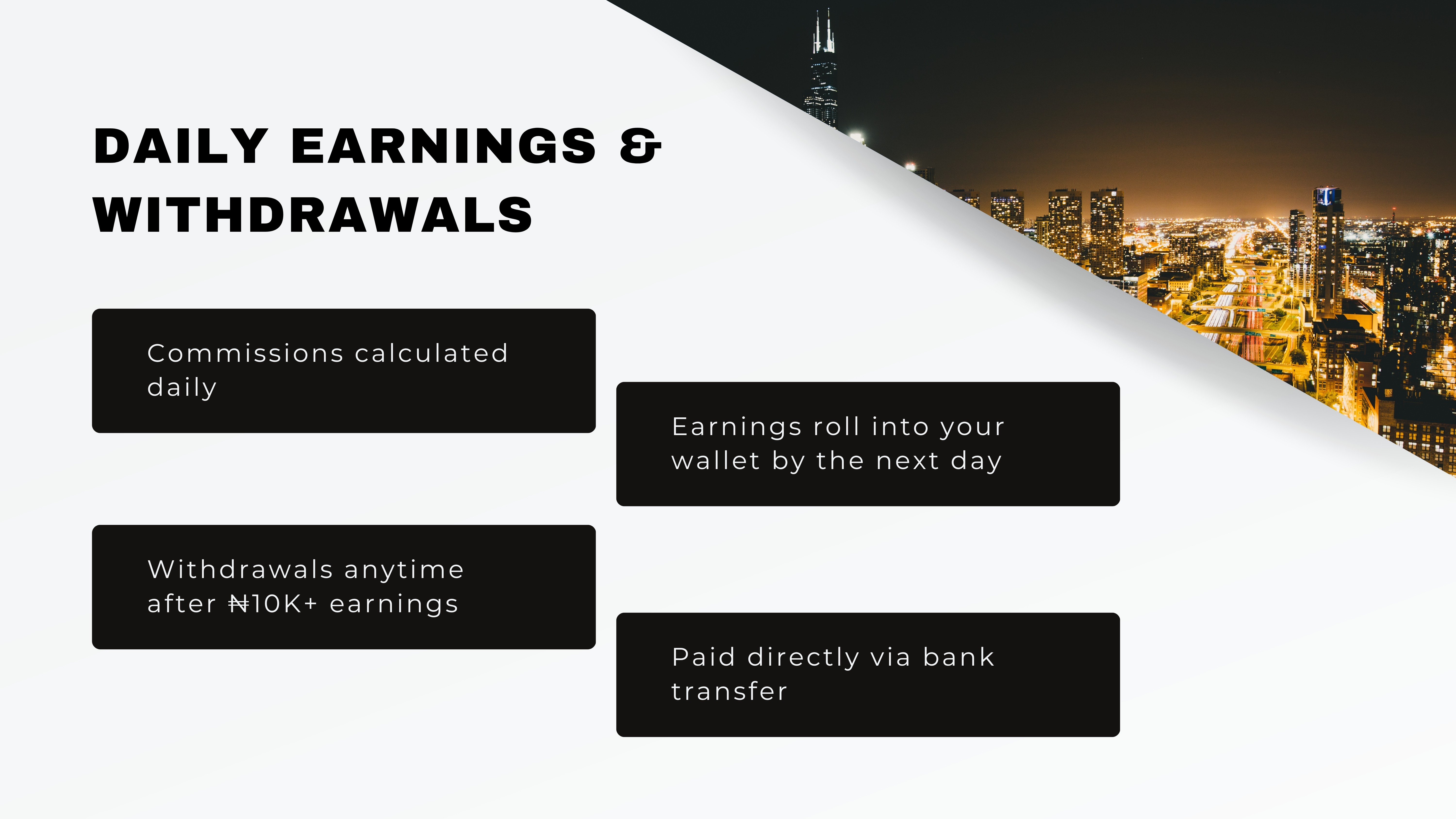 You earn ₦110K per ₦200K sale, ₦20K per ₦50K affiliate kit sale, and ₦70K on every renewal (every two months). All payouts are tracked in your dashboard and processed directly to your wallet daily. Fast and transparent.